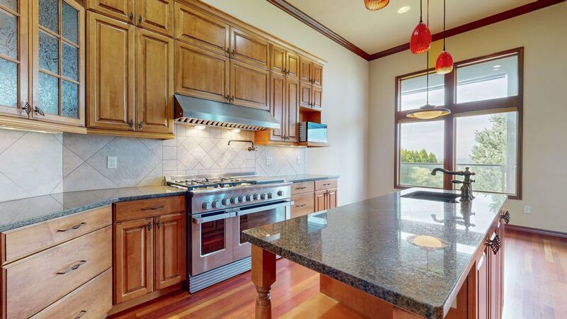 * Stainless steel appliances in the kitchen with an island